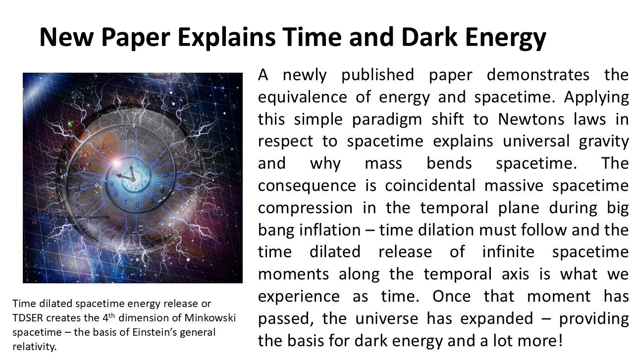 A new theory, Time Dilated Spacetime Energy Release or TSDER proposes an essentially simple answer, starting with a simple proof of a missed step on gravity. Cause-and-effect explanations for previously unexplained universal gravity and a modified big bang follow. One that offers a perfect cause-and-effect fit with how we experience time. A definition which is consistent with both special and general relativity (which I will explain in simple terms if you are unfamiliar). TDSER provides a cause and effect theory of time, gravity, dark matter and dark energy, where conventional theories describe these only as effects.